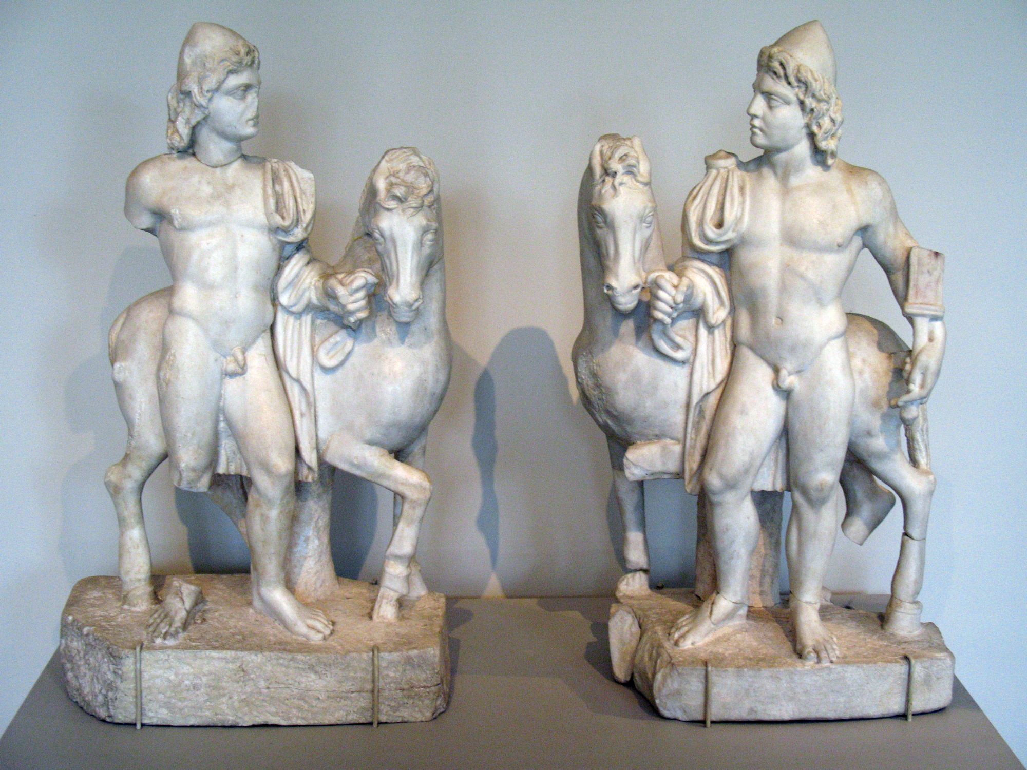 En el arte clásico, especialmente en la escultura y la cerámica griega y romana, Castor y Pólux han sido representados con frecuencia. Se les suele mostrar como jóvenes de apariencia heroica, a menudo acompañados de sus atributos distintivos: el caballo y los guantes de boxeo, símbolos de sus habilidades y hazañas. Estas representaciones no solo capturan su vigor y heroísmo, sino que también simbolizan los ideales de la fraternidad y la valentía.