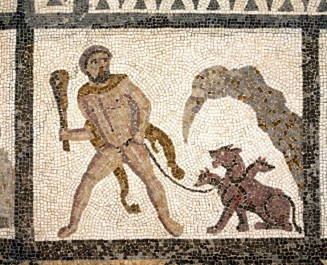 Jarrón griego con imagen de Heracles y Cerbero. Mosaico del siglo III aC en el que se muestra a Heracles y Cerbero.