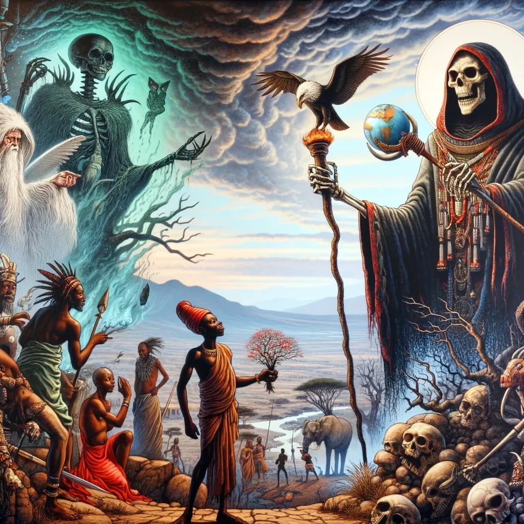 En la rica y diversa mitología africana, las figuras de Gauna y Cagn en las creencias de los Bush (también conocidos como San o Bosquimanos) de África Meridional ofrecen una visión única de la cosmología y las narrativas mitológicas de esta región.